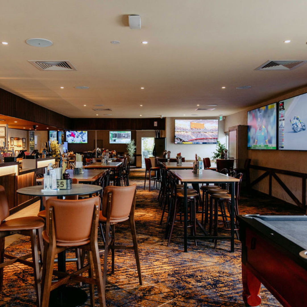 A breezy, pet-friendly outdoor space for smaller functions and sundowners, the Verandah can accommodate up to 50 people standing or sitting, and has one large TV screen.